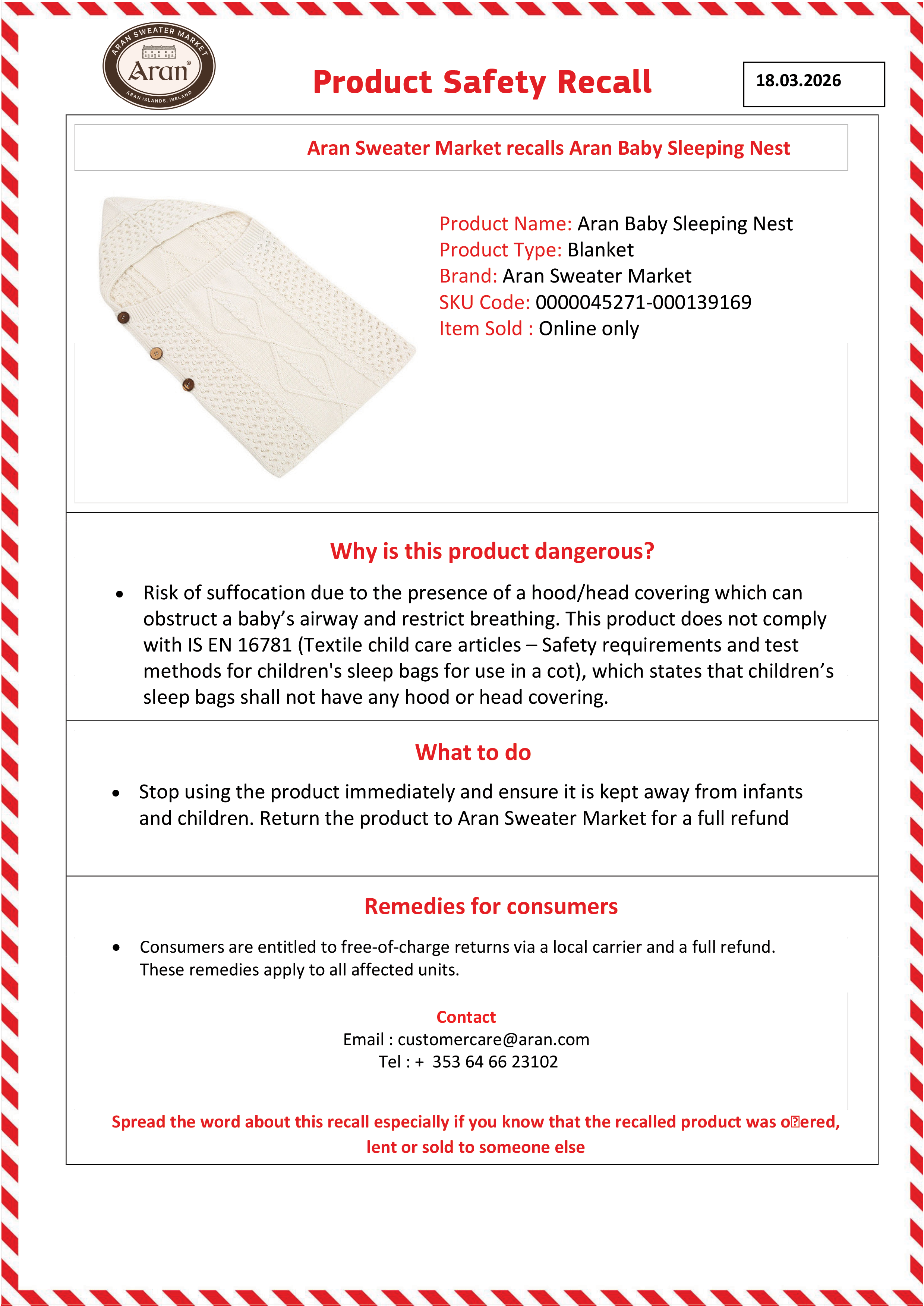 We are voluntarily recalling the Aran Baby Sleeping Nest due to a potential safety risk identified during review.